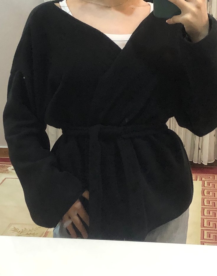 BU İLANI ALMAYINIZ Ölçülerinize göre dikim yapılır Siyah, bol kesim, uzun kollu, kuşaklı ve yumuşak ince kaşe kumaştan bağlamalı hırka.