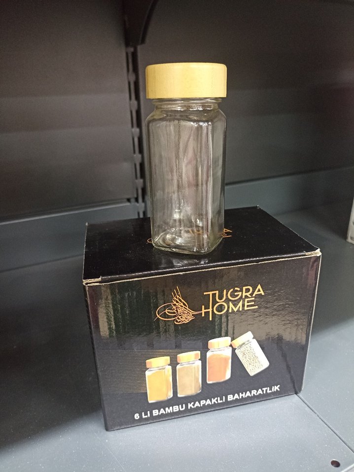 Bambu kapaklı, cam gövdeli baharatlık seti. 6'lı set olarak sunulmuştur.