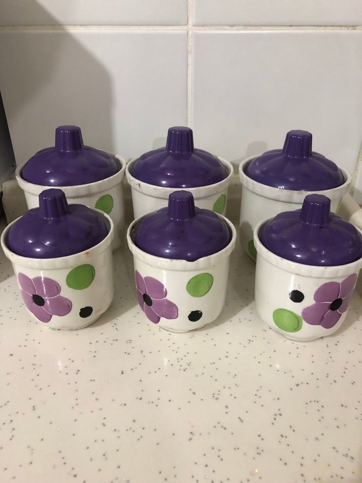 Altı adet mor kapaklı, çiçek desenli seramik mutfak kavanoz seti, baharat veya küçük malzemeler için uygun. Resimde görüldügü gibi minik kırıklar var kullanıma engel değil o yüzden fiyatı uygun tutuyorum