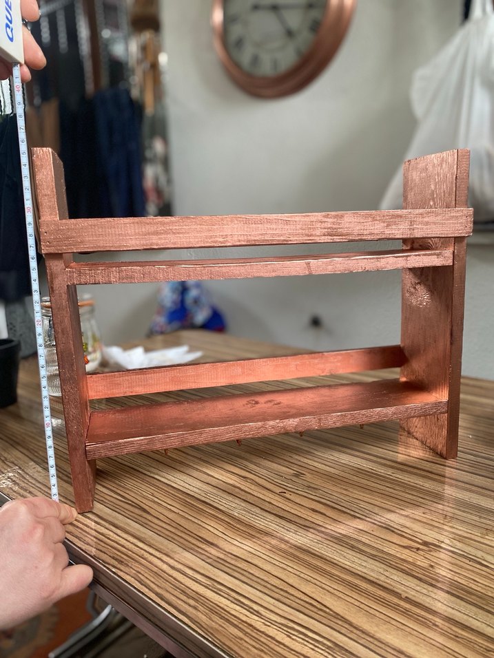 Parlak bej renkte, ahşap malzemeden yapılmış, çocuk eşyalarını düzenlemek için uygun basit ve sağlam tasarımlı raf. Baharatlık yada kozmetik ve takı standı