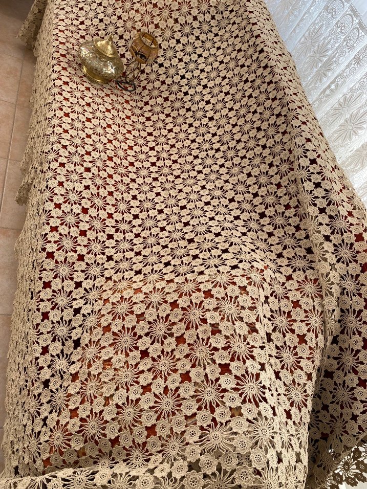 Pirpirim model çok emekli çiçekler tek tek yapılarak birleştiriliyor.Ağ ipi.Rengi el işlemeciliği ile gözlere evlere çok yakışacakEl yapımı bohem tarzı dantel yatak örtüsü, detaylı çiçek desenleriyle vintage bir dokunuş sağlar.Klasik möblelere çok yakışır. İstenirse masa örtüsü olarak da kullanılabilir.