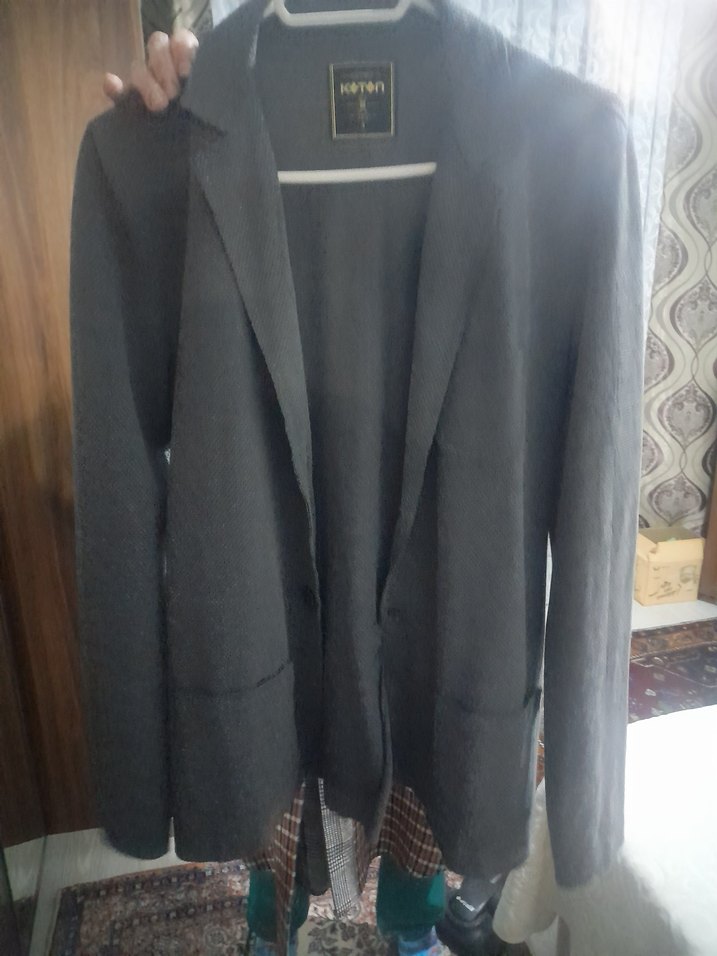 Gri renk, keten kumaştan kadın blazer ceket. Normal boy, uzun kollu ve düğmeli, ofis kullanımı için uygundur.
