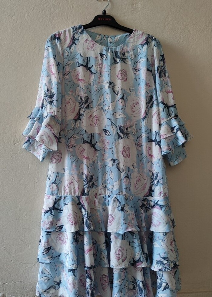 40-42 bedene uyumlu, çiçek desenli, viskon kumaş, baharlık - yazlık, midi boy tasarım elbise. Çok tatlı bebek mavisi bir rengi vardır. Defosu yoktur. BUTİK MARKADIR.