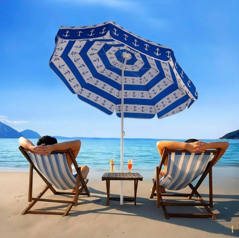 Mavi renkte, çapa desenli, drapeli bohem ve retro Paris tarzı plaj bahçe şemsiyesi.