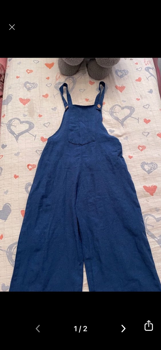 Koyu mavi renkte, yumuşak keten kumaştan yapılmış, düğmeli askılı bol paça erkek çocuk keten tulum. Bohem tarzda, ön cep detaylı.