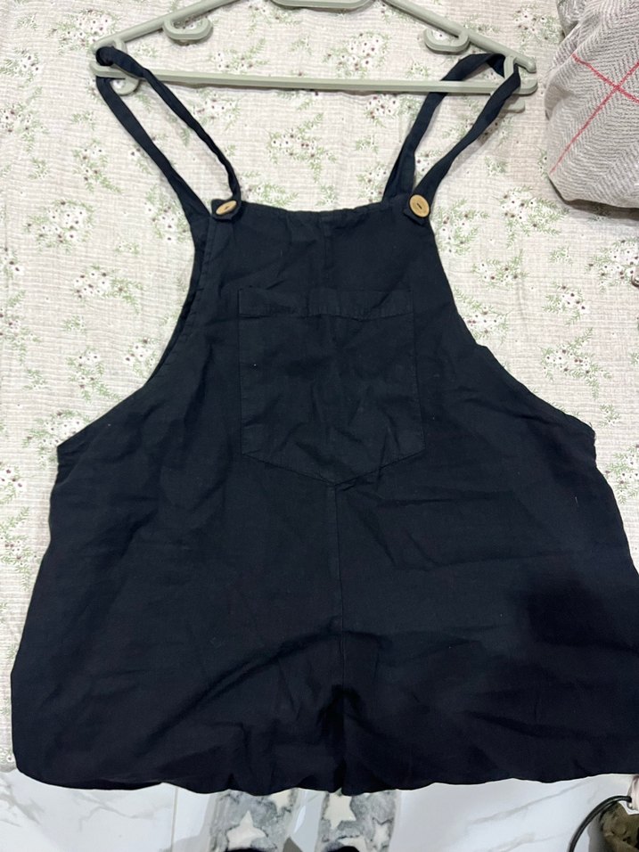 Düğmeli askıları ve önü cep detaylı, keten kumaştan yapılmış siyah, bol kesim askılı şort tulum. Günlük kullanım için uygundur. %100 koton