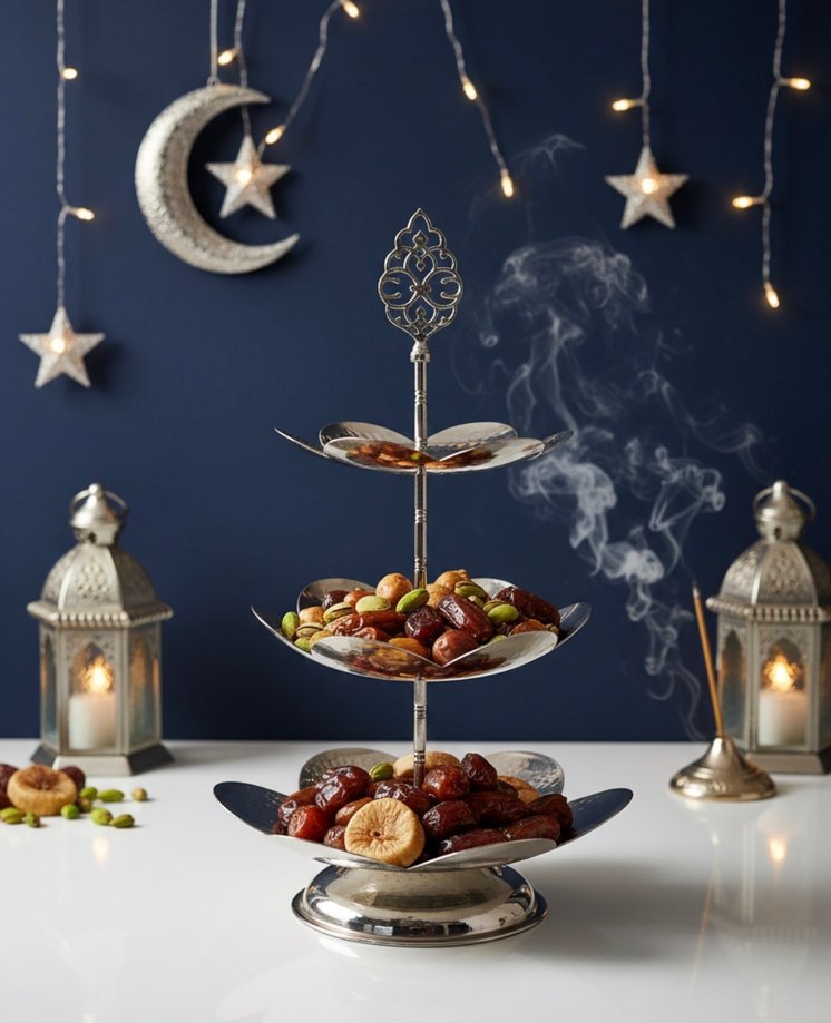 Parlak altın rengi ve etnik desenlere sahip üç katlı sunum tabağı, kuruyemiş ve kuru meyveler için uygundur. Geleneksel tarzı ve kullanışlılığı bir arada sunar. ✨