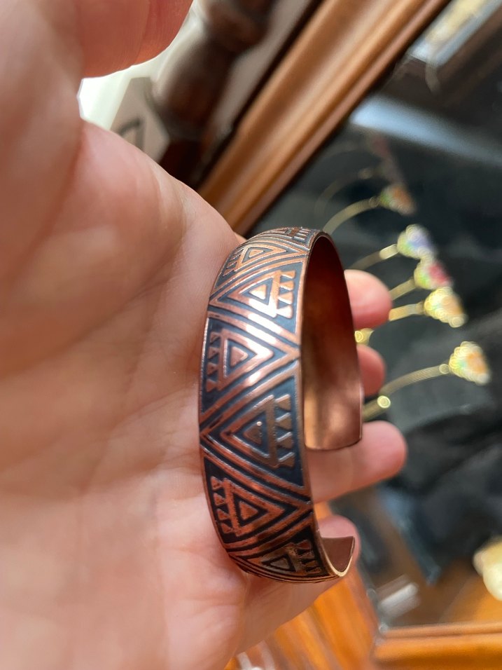 Bakır bohem desenli bakır bileklik. Üzerinde kilim motiflerimizden tılsım modeli bulunmaktadır tılsım modeli nazardan ve kötü bakışlardan insanları koruyacağına inanılırdı.