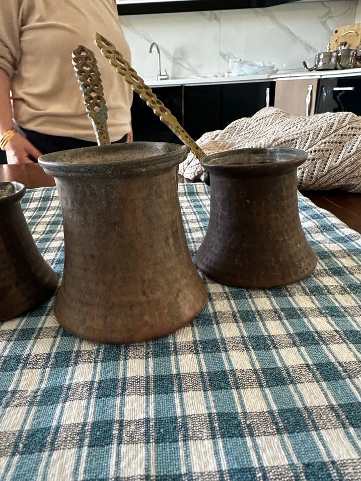 Bakır cezve seti, kahverengi ve gri tonlarda