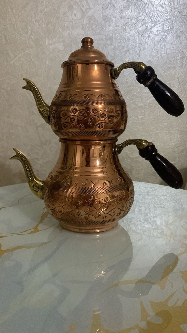 İşlemeli desenlere sahip iki bakır çaydanlık ve koyu renkli ahşap saplardan oluşan geleneksel tasarımlı çaydanlık seti.