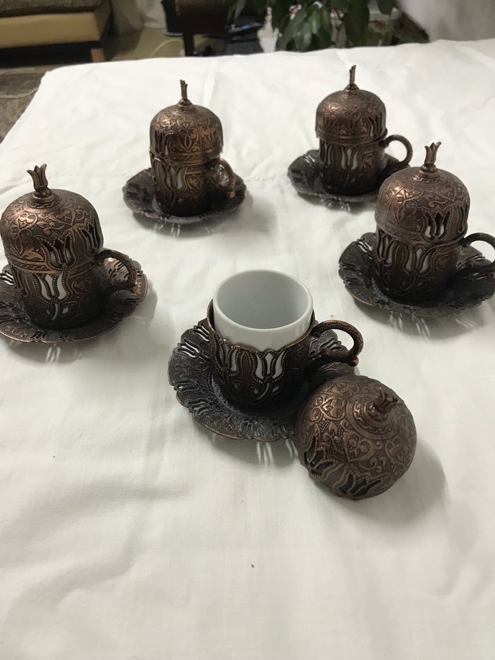 Bakırdan yapılma, kapaklı otantik kahve fincanları. 6 adet var ama bir tanesinin tabağında kırık var. O yüzden 5 adet satılık.