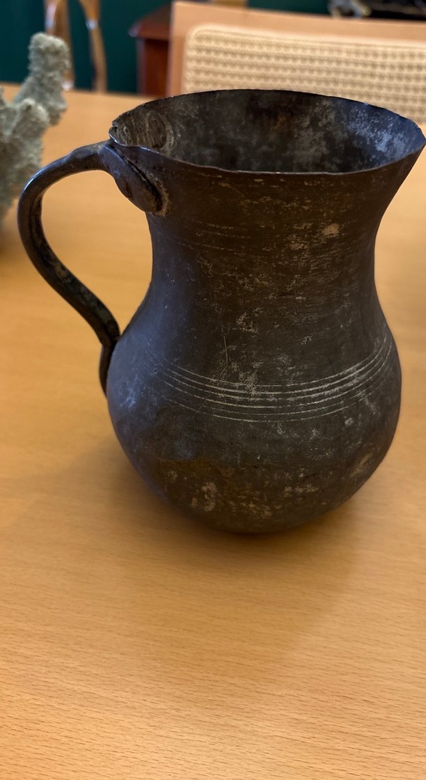 Koyu kahverengi kulplu vazo, hafif aşınmış görünüm ve gövdesinde ince yatay çizgiler bulunur.