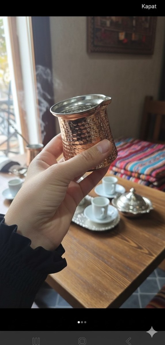 Parlak kahverengi bakırdan yapılmış, dokulu yüzeye sahip kahve cezvesi. ☕2 kişilik