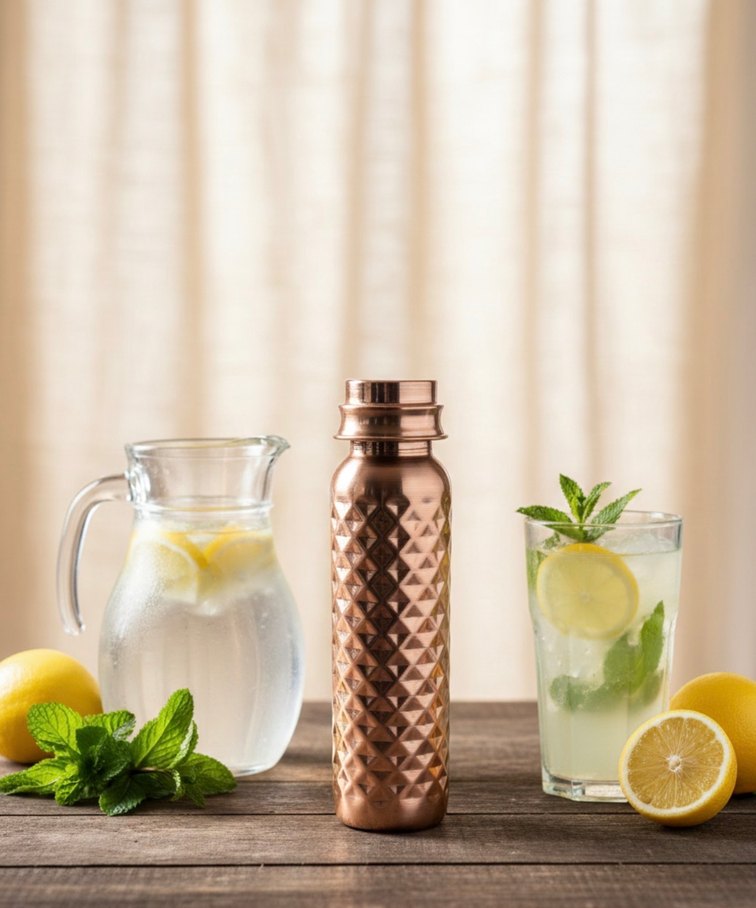 Bohem tarzda, yılan desenli ve parlak yüzeye sahip şişe. İçecek servisi için şık ve farklı bir seçenek.