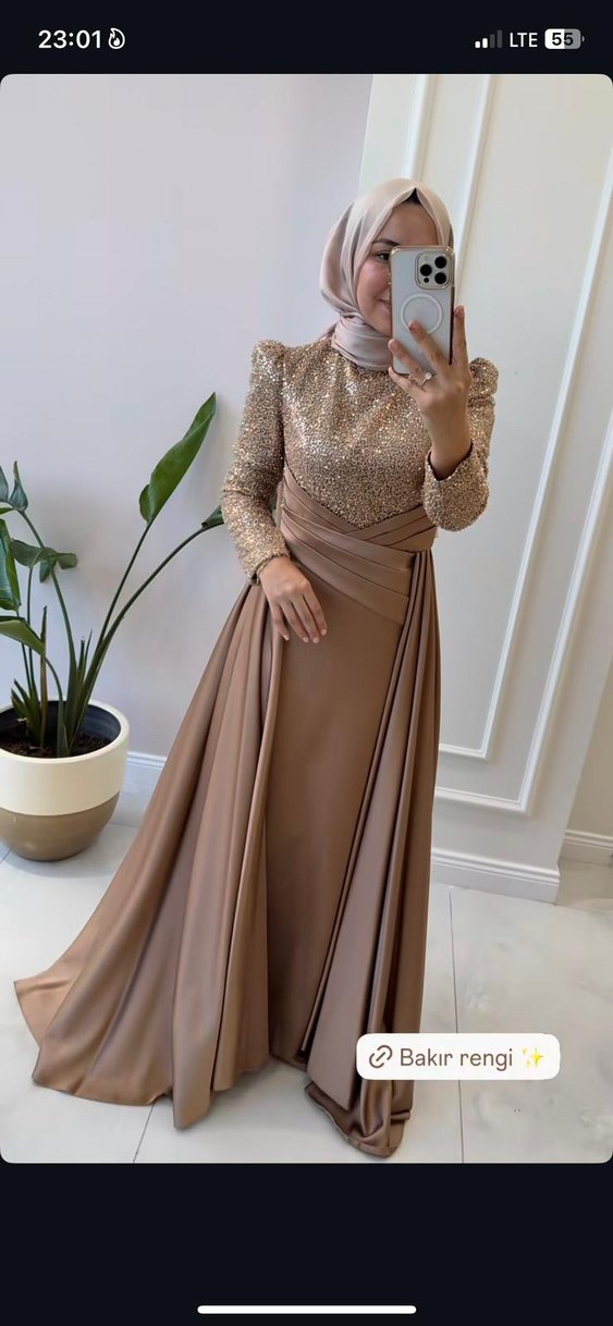 Bu bakır rengi uzun abiye elbise, parlak kumaş, yüksek yaka ve uzun kollara sahiptir. Drapeli ve modest tarzıyla düğünler için uygundur. ✨
