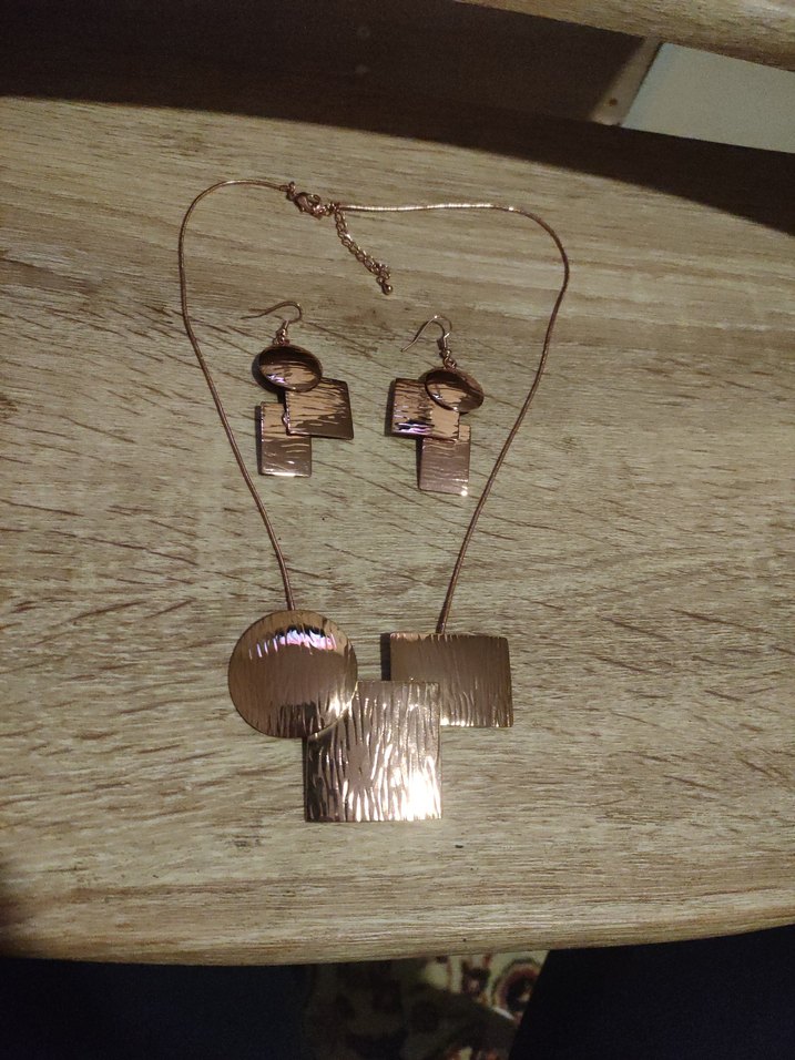 Bakır renginde, dokulu geometrik şekilli kısa bohem kolye ve uyumlu küpe seti, günlük avant-garde tarz için uygun. ✨