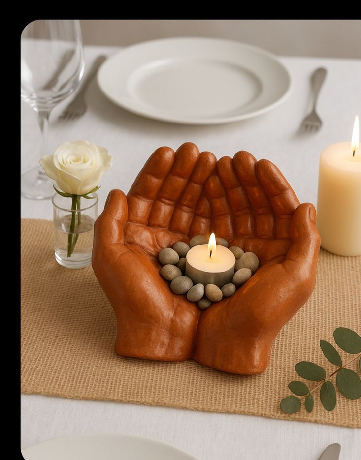 İki el şeklinde tasarlanmış, içinde küçük bir mum ve dekoratif taşlar bulunan bej renkli mumluk. Masanıza sıcaklık katar. ️
