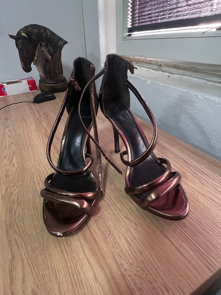 Bakır renkli , parlak , tokalı bantlı stiletto topuklu ayakkabı. Romantik akşamlar için cesur ve şık tasarım.