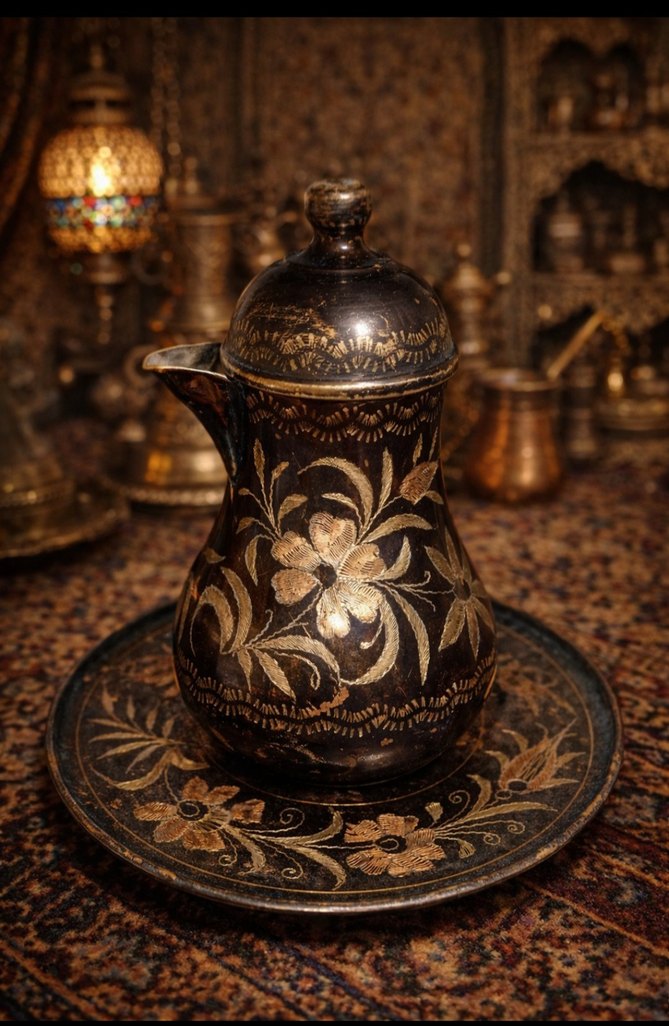 Tarihi bilinmeyen eski bir üründür. Yükseklik 13 cm Tabak iç çap 14 cm dir. Videoda en ince ayrıntısına kadar gözükmektedir. Ve flaşlı ve flaşsız Fotoğraflarda gözüktüğü gibidir. Sürahinin arka sapı yoktur bunu bilerek Video yu izleyip alabilirsiniz.Tabakda bazı yerlerde ufak deforme mevcuttur Koyu renkte, altın işlemeli çiçek desenleriyle süslenmiş demlik ve tabak seti. Geleneksel sunum için uygundur.