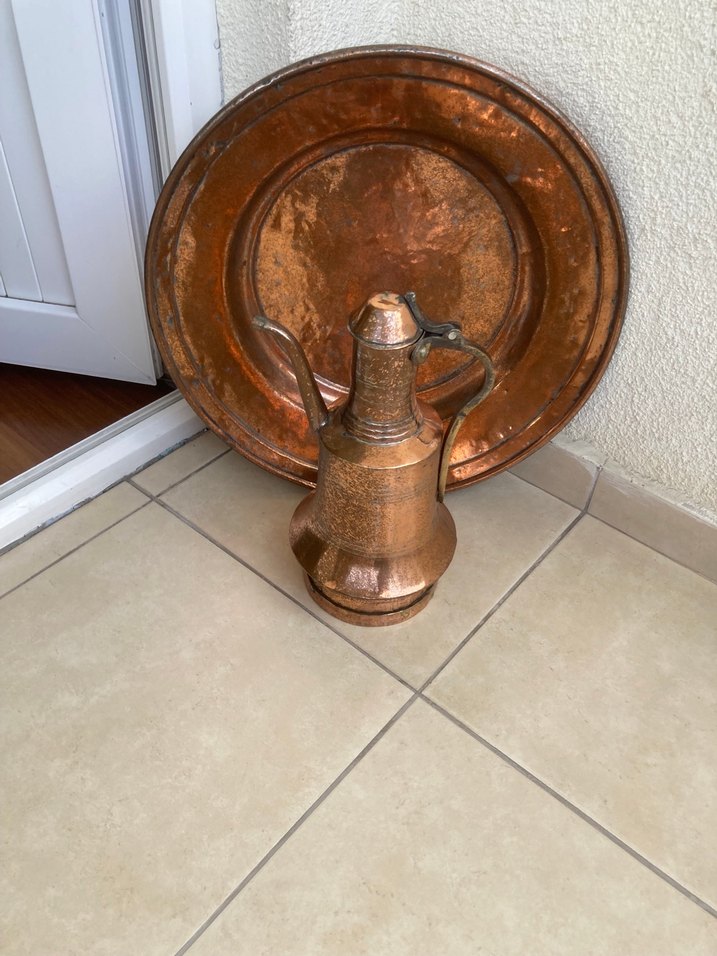 Parlak kahverengi, desen içermeyen geleneksel tarzda bir ibrik ve altlığı