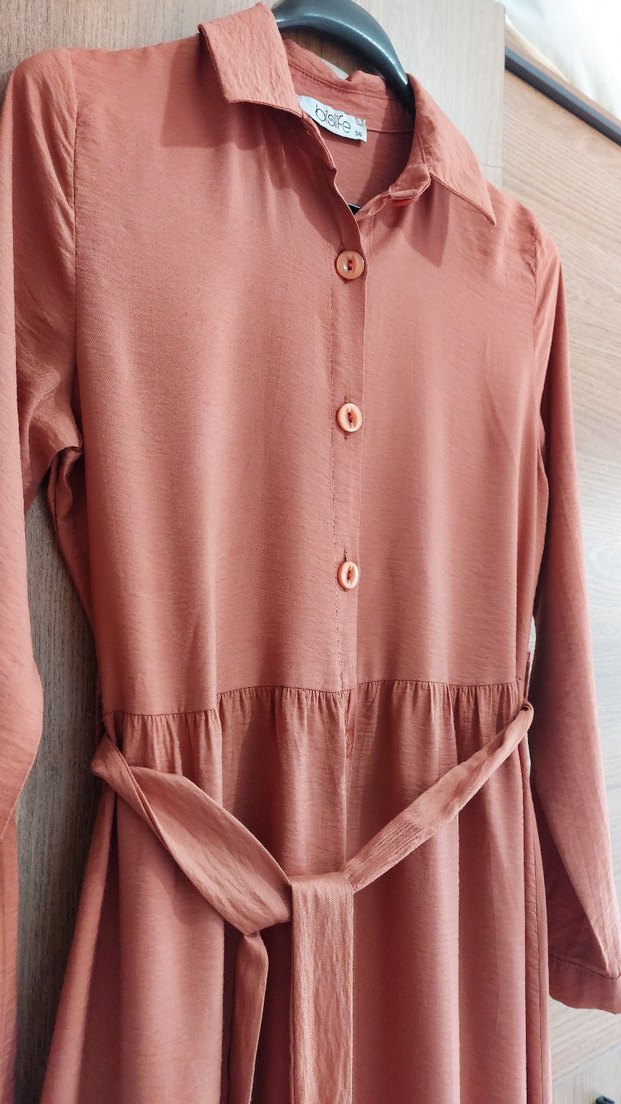Bakır renkli, uzun kollu, düğmeli ve yakalı tesettür elbise, ince ve rahat dokusu yaz için tam uygundur.Günlük kullanim içindir.Kemer dahildir.Astarsızdır.Hiçbir yerinde defo yoktur.Sadece birkaç kez giyilmiştir.Temizdir.Sefamerveden alınmıştır. Dar geldiği için satılıktır.