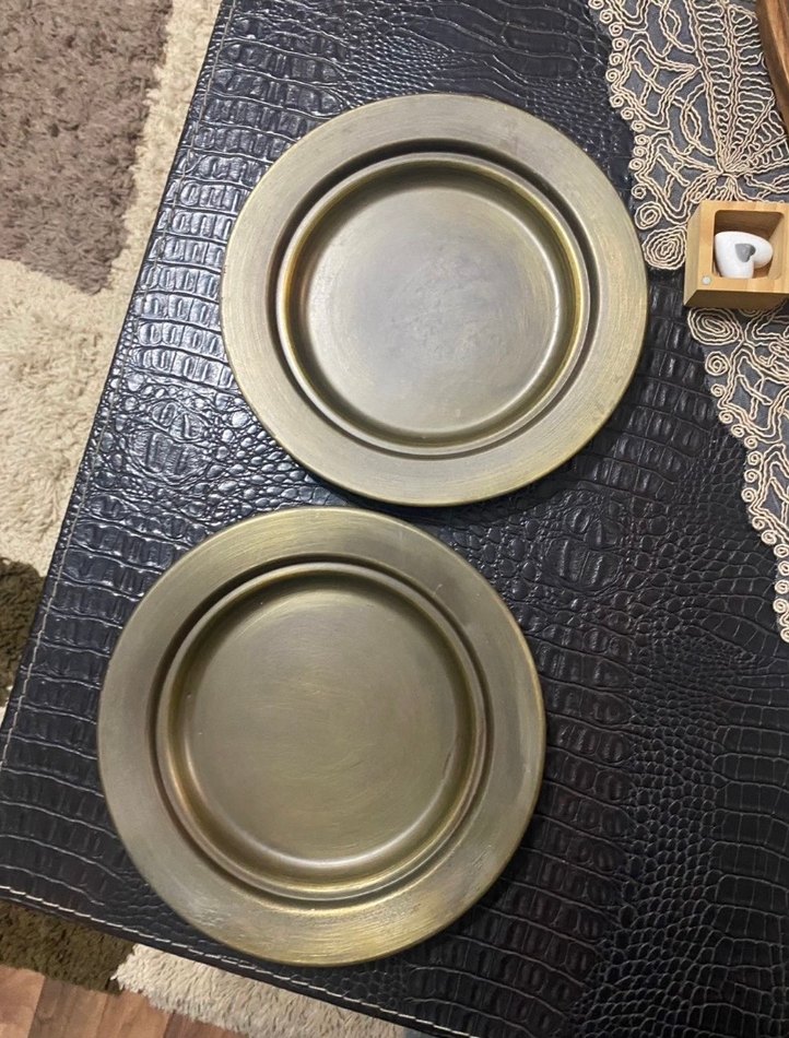 İki adet bakırrenkli, klasik stilde desensiz metal tabak seti. ️