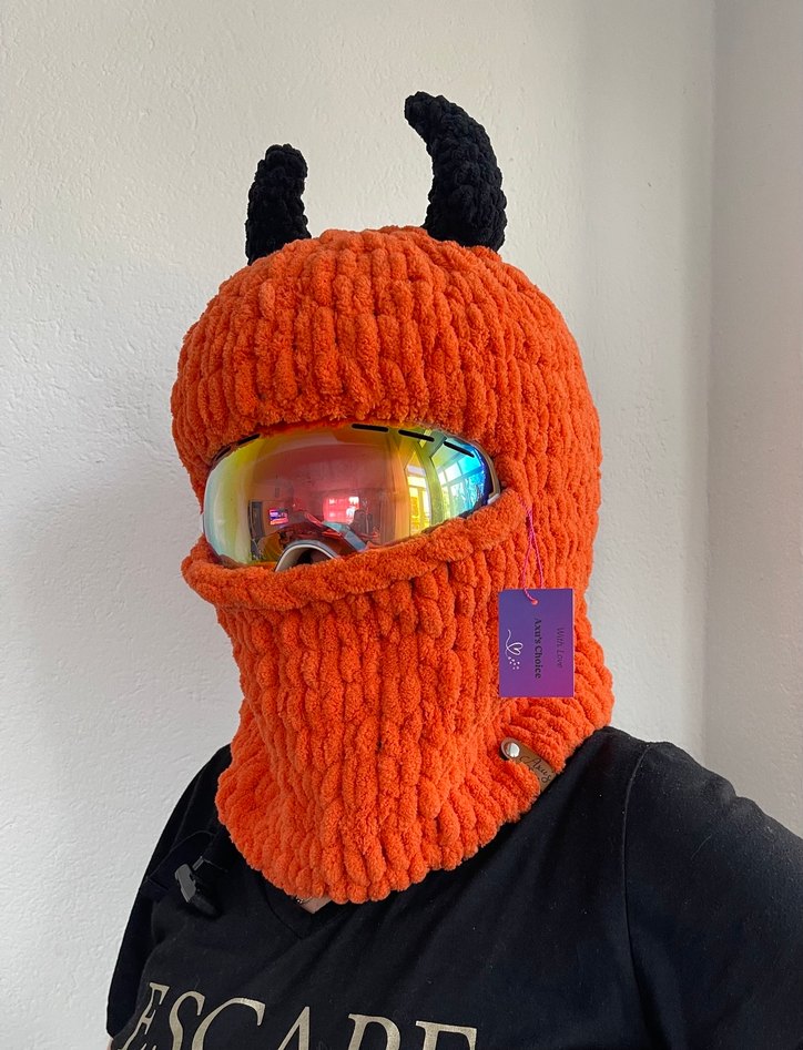 Koyu turuncu renkli, örgü kadın bere, yumuşak ve sıcak fleece kumaşla, iki siyah boynuz detayıyla dikkat çekiyor.