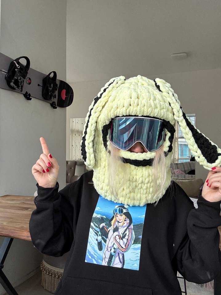 Siyah pastel renkli, kalın örgüden yapılmış, rahat ve sıra dışı tarzda kadın bere. Rock punk havası taşıyor.