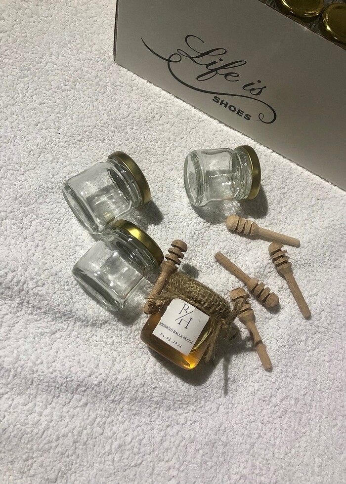 Size özel süslenmiş hali ile adet fiyatı 32tl dir Boş hali ile elimde toplam 20 şişe vardır kapaklı adet fiyatı 8 tl Bal kaşığı toplam 17 adet adet fiyatı 5 tl dir KİŞİYE ÖZEL HAZIRLANMASI İÇİN saryatasarimm instagram hesabından yazabilirsiniz