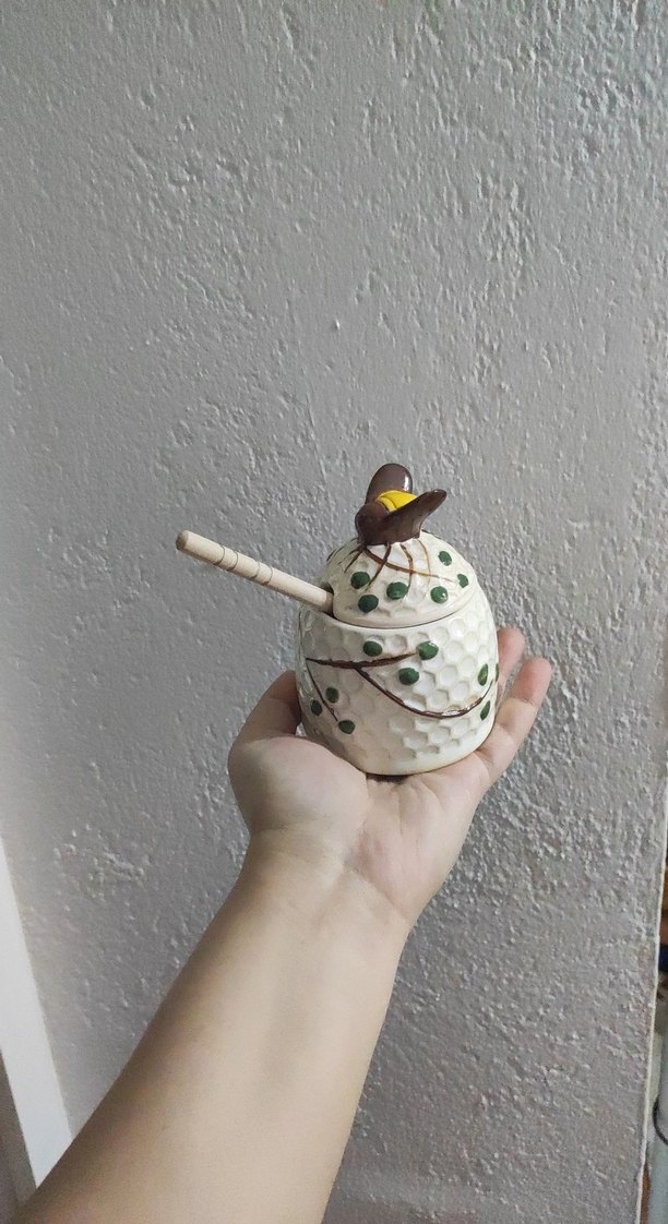 Dokulu yüzeye sahip beyaz seramik baharatlık, kapağında küçük bir kuş ve yeşil noktalar bulunur. Kullanımı kolay kaşığı ile birlikte gelir.
