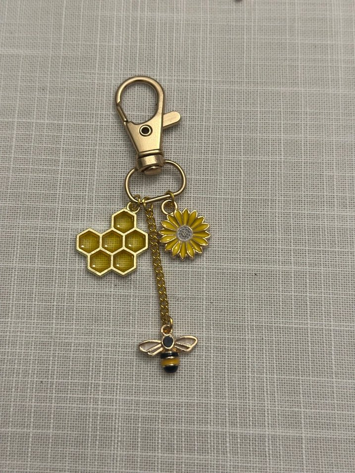 Yurt dışından getiriyorum kendim birleştiriyorum. Parlak altın renkte, zincir detaylı anahtarlık; arı, ayçiçeği ve petek figürlü, minimal bohem tarzını yansıtıyor.