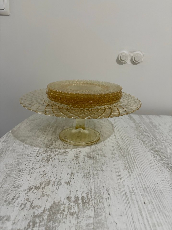 Desensiz, açık ton bal renginde renginde vintage tarzında ayaklı servis tabağı ve tatlı tabağıdır