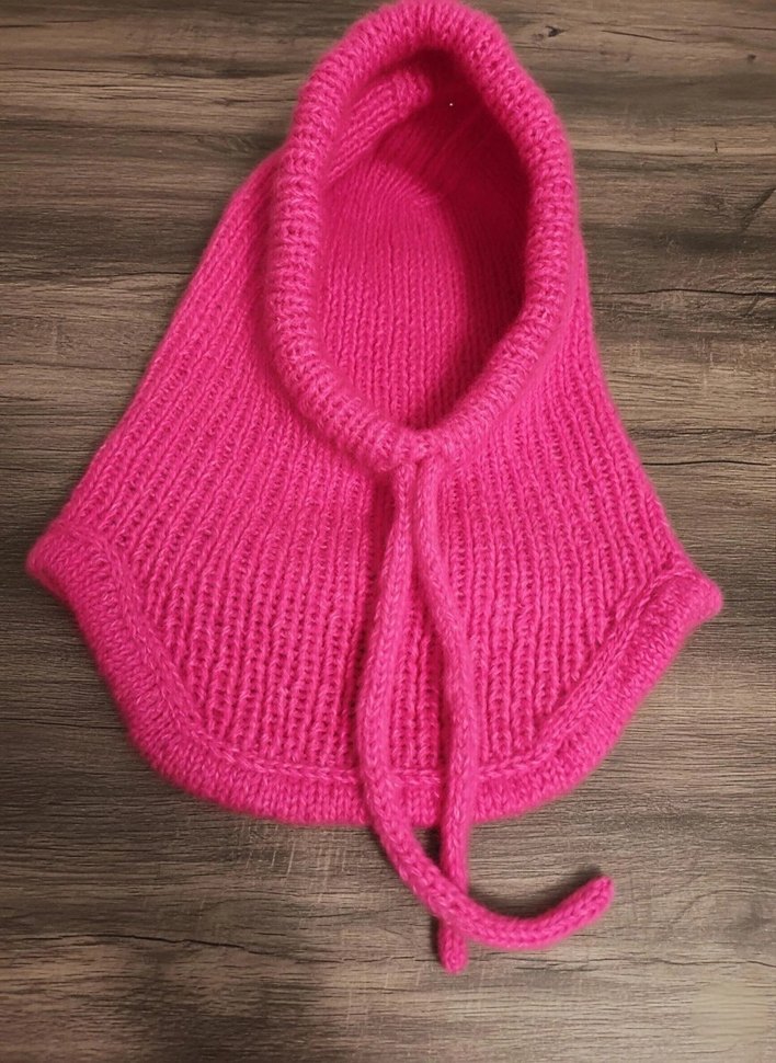 Canlı pembe renkli, örgü çocuk ve yetişkin bere ve boyunluk. Düz ve desensiz, bohem tarzda, bağcıklı ve yumuşak moher ipten yapılmıştır.