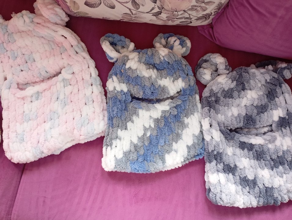 Gri ve mavi tonlarında bağlama desenli örgü bere ve atkı seti, sevimli ayı kulaklarıyla çocuklar için tasarlandı.