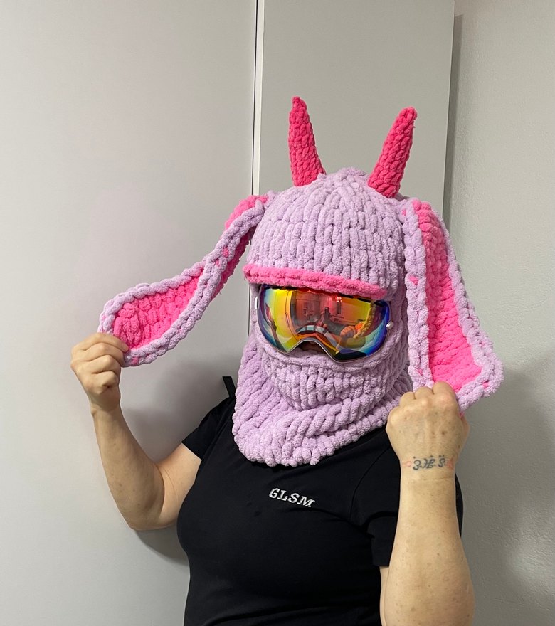 Pastel pembe örgü bere, avant-garde tarzda boynuz ve kulak detaylarıyla dikkat çekiyor. GLSM logosu bulunur. Rock punk havası verir.