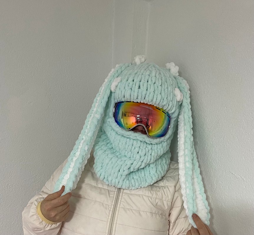 Yumuşak örgü dokusuyla turkuaz renkte, uzun kulak şeklinde uzantıları olan kadın bere, rahatlığı ve avangart tarzı bir araya getiriyor.
