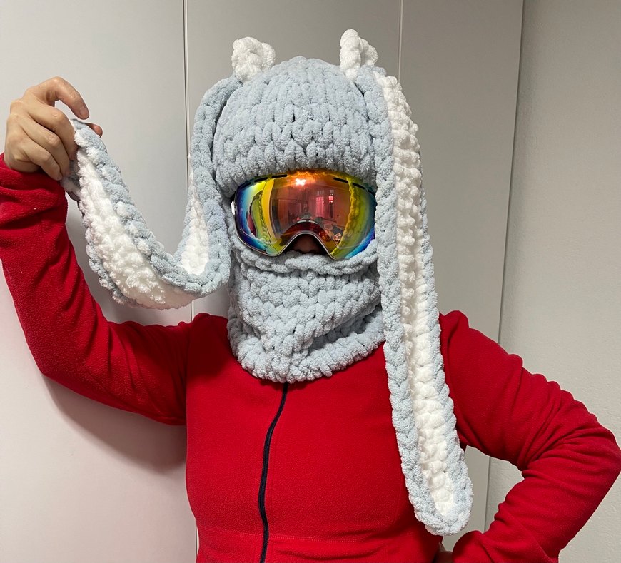 Yumuşak ve sıcak kumaştan örülmüş gri kadın bere, uzun kulak şeklinde uzantılarla rahat ve avangart tarzda.