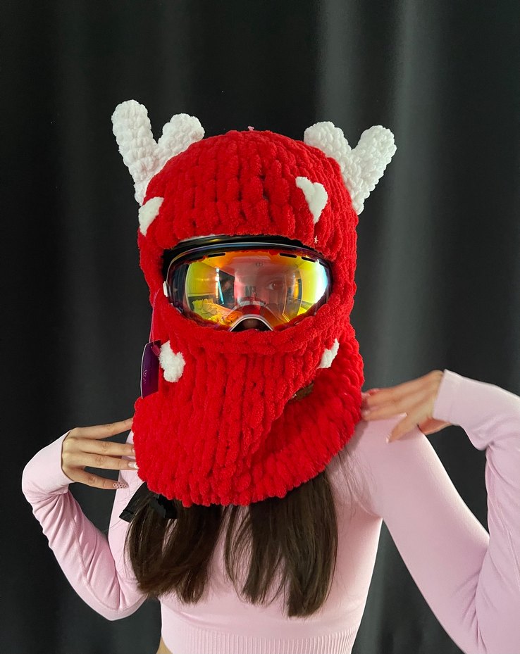 Renkli örgü kadın bere, beyaz detaylı boynuz görünümlü süslemelerle dikkat çeker. Baş ve boynu kapatan, rahat ve avangart bir tasarıma sahiptir.