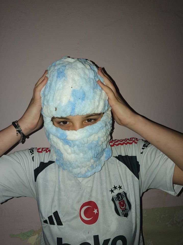 Baş ve boynu örten mavi beyaz yumuşak örgü maske, soğuk havalar için uygun.