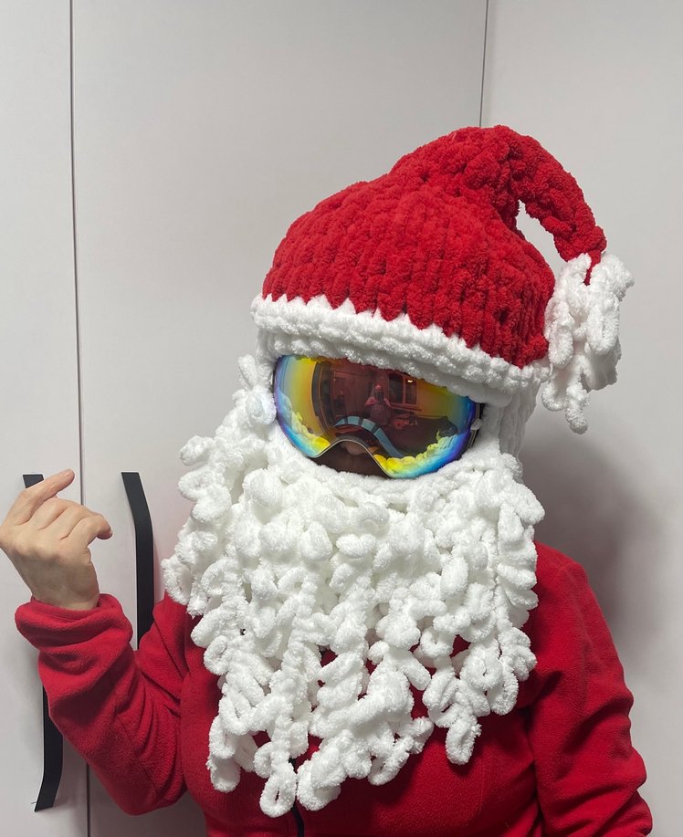 Renkli örgü malzemeden yapılmış, kırmızı Noel Baba şapkası ve dokulu beyaz sakallı kayak gözlüğü kılıfı, rahat ve pop kültür tarzında.