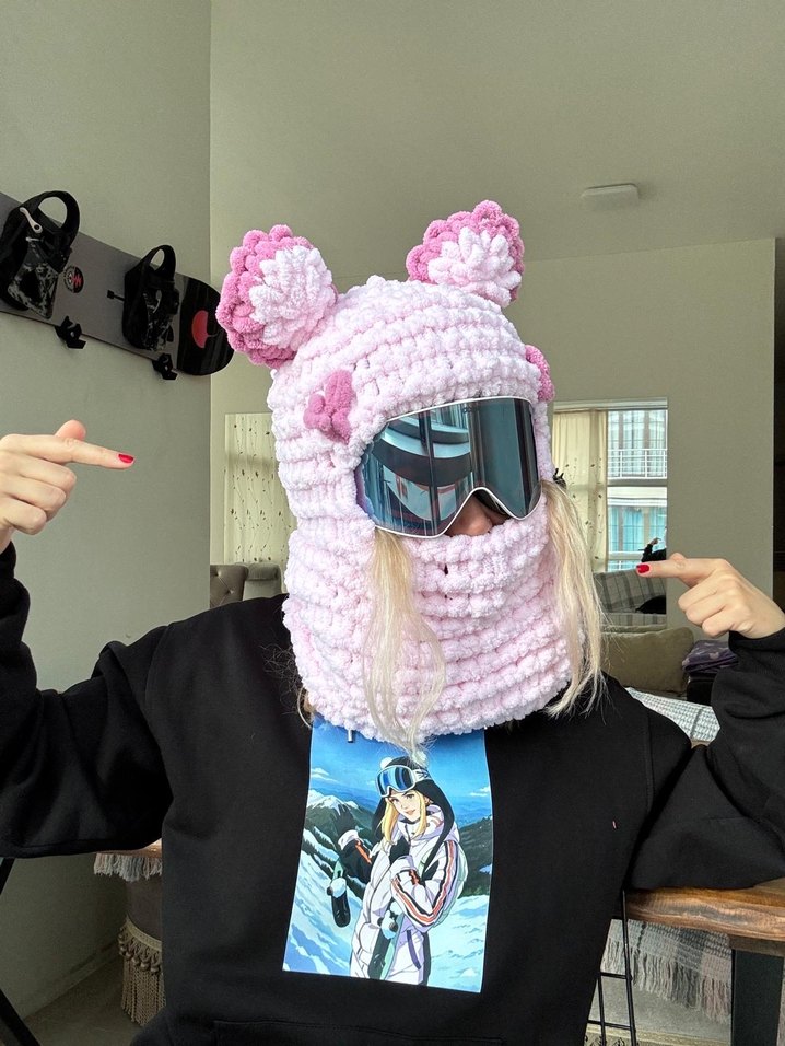 Pastel pembe örgü, avant-garde tarzda, kulak detaylı ve yüzü tamamen kapatan kadın bere. Trend belirleyicilere uygun.
