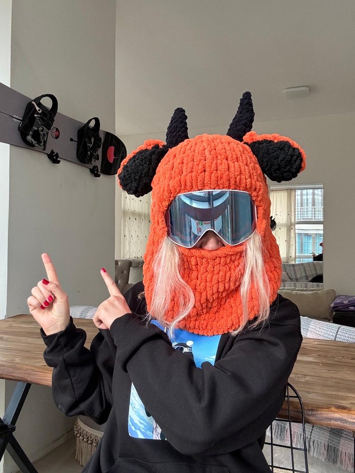Turuncu örgü, rahat ve punk esintili kadın bere, eğlenceli boynuz detaylarıyla kış stilinize rock havası katıyor.