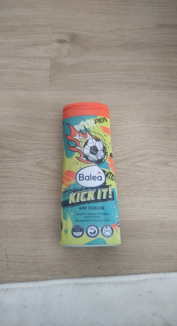 Balea Kick It! 4'ü 1 arada duş jeli, yüz, vücut, şampuan ve köpük banyosunu bir arada sunar. Renkli ambalajda sportif ferah koku ⚽