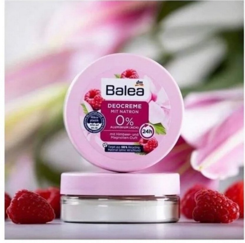 Balea natronlu deodorant kremi 0% alüminyum içerir ve 24 saat koruma sağlar. Ahududu ve manolya kokusuyla ferahlatır. sadece 2 kez kullandım açık haliyle son fotoğraf ta var