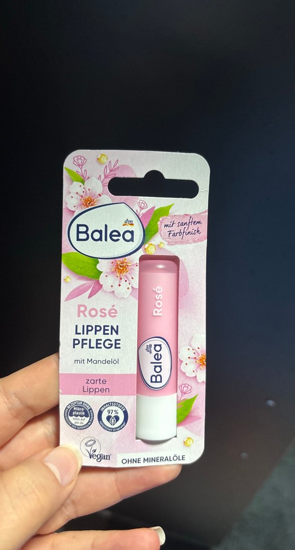 Balea Rosé dudak bakım ürünü, badem yağı ile yumuşak PEMBE pastel ton verir. Vegan ve mineral yağ içermeyen formülüyle dudakları nazikçe nemlendirir.