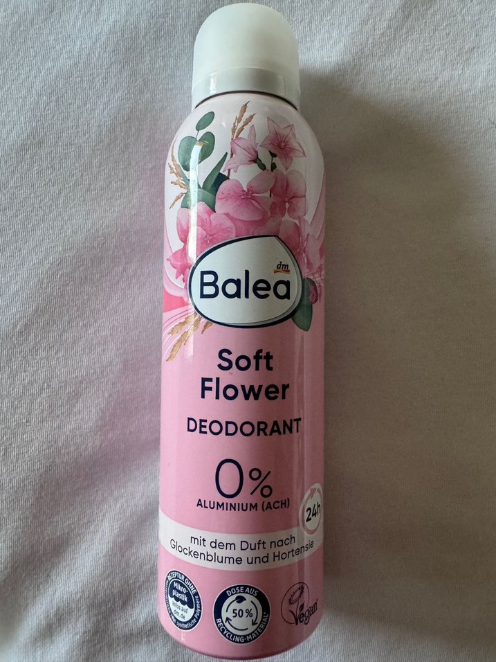 Balea Soft Flower deodorant, alüminyum içermeyen vegan formülü ve çiçeksi kokusuyla 24 saat koruma sağlar. %50 doğal içerik barındırır.