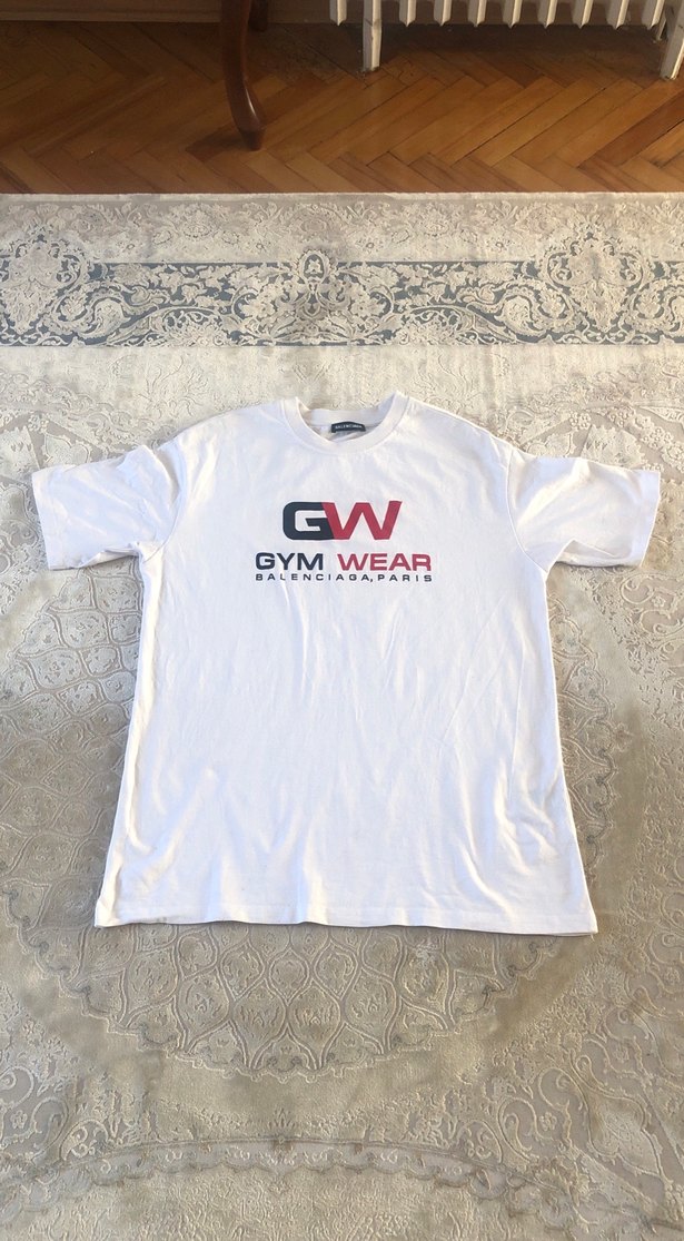 Balenciaga beyaz erkek tişört, kısa kollu ve yuvarlak yaka. Gri ve kırmızı baskılı 'GYMWEAR' yazısı, pamuklu ve rahat. Salaş kesim, spor sokak stili için uygun. Tiki kol aştı 54 boyu 75 cm