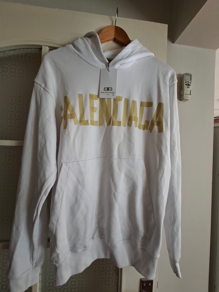 Balenciaga marka beyaz kapüşonlu sweatshirt, bol kesim, bisiklet yaka ve uzun kolludur. Önünde baskılı logo ve rahat kapüşon bulunur. ölçü görselledim koton
