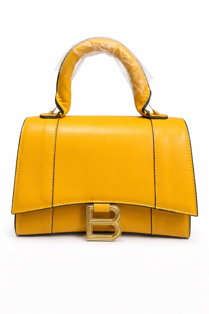 Canlı sarı renkte deri, tokalı ve baskılı desenli kadın çantası, günlük kullanıma uygun modern ve minimalist tarzda.