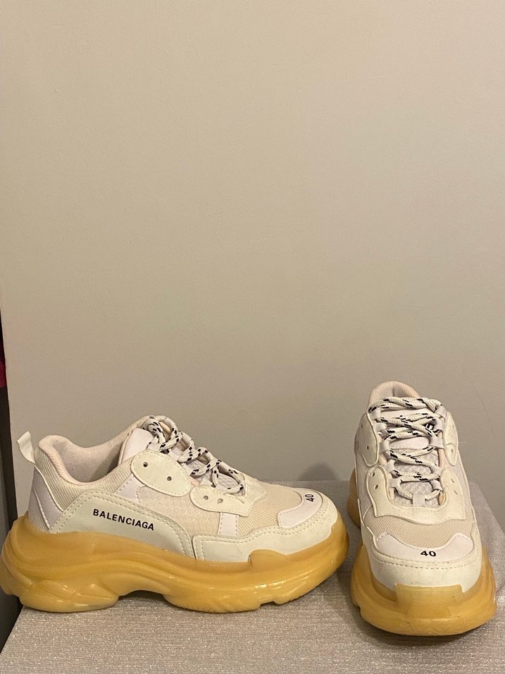 Az kullanılmış Beyaz platform topuklu kadın spor ayakkabısı, kauçuk tabanlı ve BALENCIAGA yazılı, desen içermeyen şık bir tasarıma sahip. Trendy casual stil için uygundur.